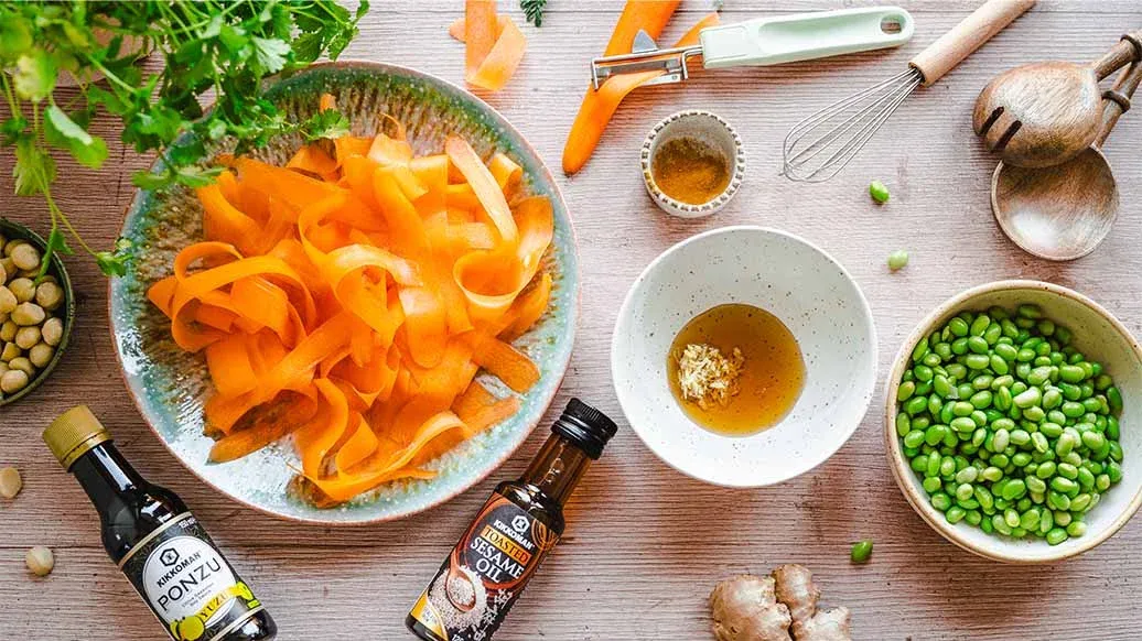 Pele las zanahorias y córtelas en finas tiras con la ayuda de un pelador. Mézclelas con la Salsa Ponzu Yuzu Kikkoman, el Aceite de Sésamo Tostado Kikkoman, la cúrcuma y el jengibre rallado. Deje reposar durante 10 minutos.