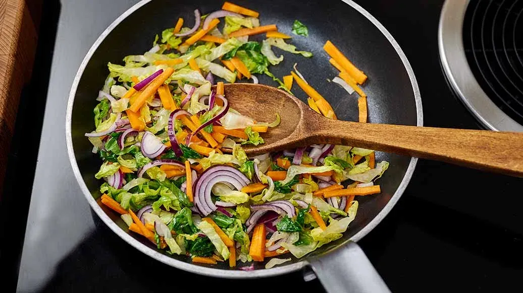 Corte la col puntiaguda y la zanahoria en tiras. Pele la cebolla, córtela en aros finos y rehogue todo en una sartén pequeña con el Aceite de Sésamo Tostado Kikkoman caliente durante unos 5 minutos.