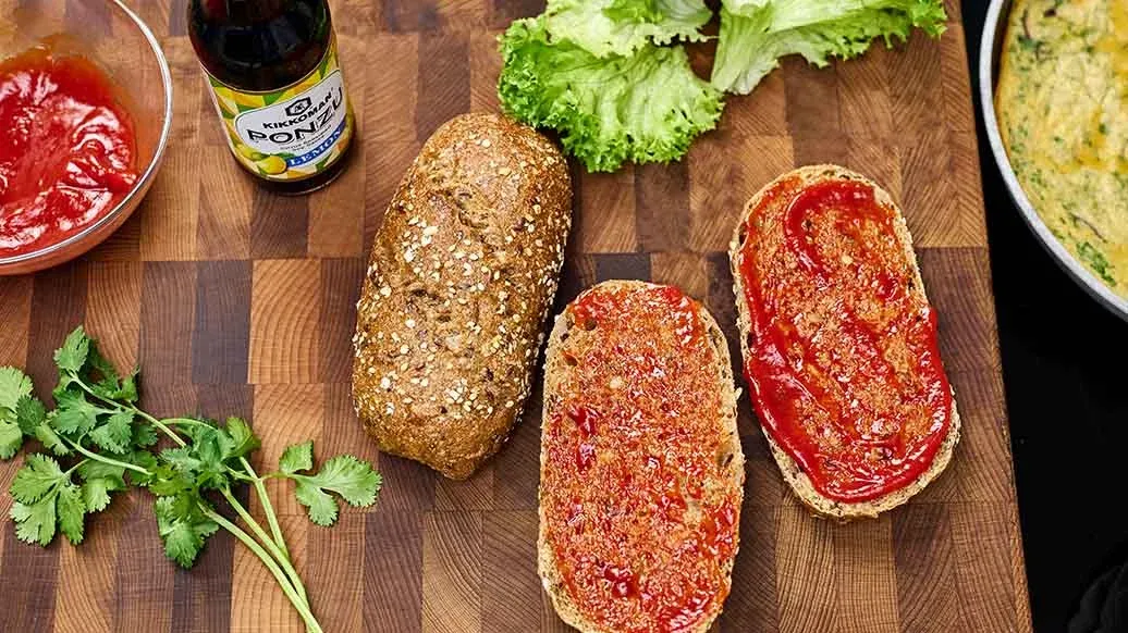 2 panecillos de baguette integral – 1 cucharada de mantequilla con sal marina – 3 cucharadas de kétchup – 2 cucharaditas Kikkoman Ponzu - Aderezo con Salsa de Soja y Vinagre, con Sabor a Limón – 1 cucharada de concentrado de tomate – 2 hojas de lechuga verde, por ejemplo, variedades como lollo bionda – Unas hojas de cilantro