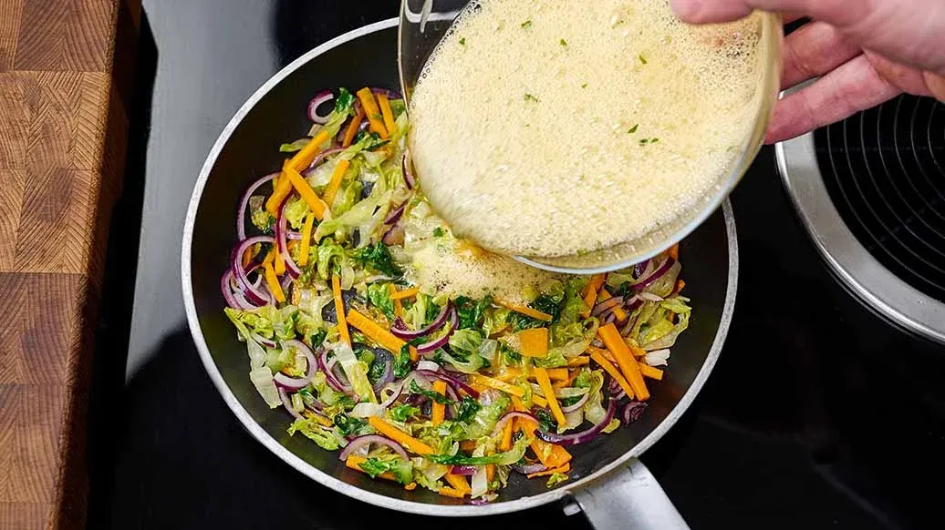 Vierta la mezcla de huevo y espinaca sobre las verduras y deje que cuaje.