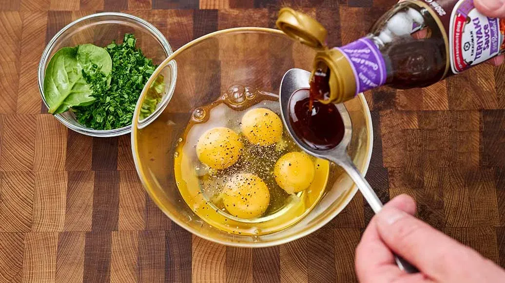 Lave las hojas de espinaca y píquelas finamente. Bata los huevos junto con la Salsa Teriyaki con ajo asado Kikkoman, sazone con pimienta y añada la espinaca.