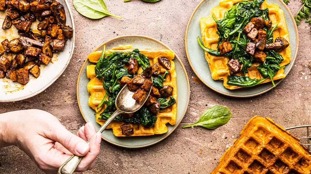 Gofres veganos de calabaza y zanahoria con tempeh y champiñones con espinacas