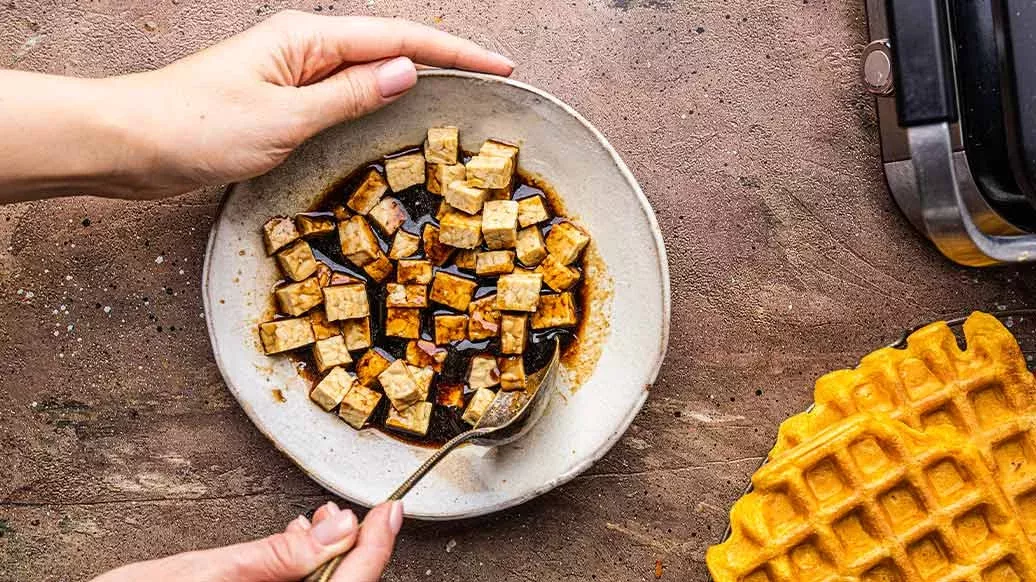 Disfruta de una versión vegana de los gofres tradicionales con esta deliciosa opción elaborada con calabaza y zanahoria. Ideales para un almuerzo abundante y saludable con un toque picante de tempeh.