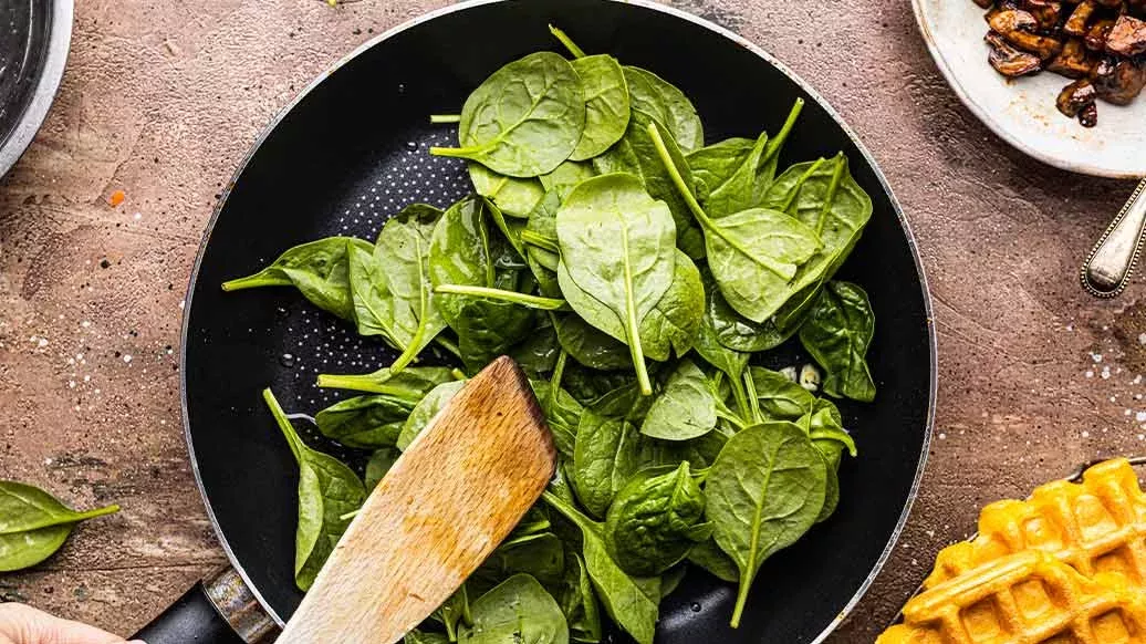 Coloque los champiñones con el tempeh y las espinacas sobre los gofres cocidos.
