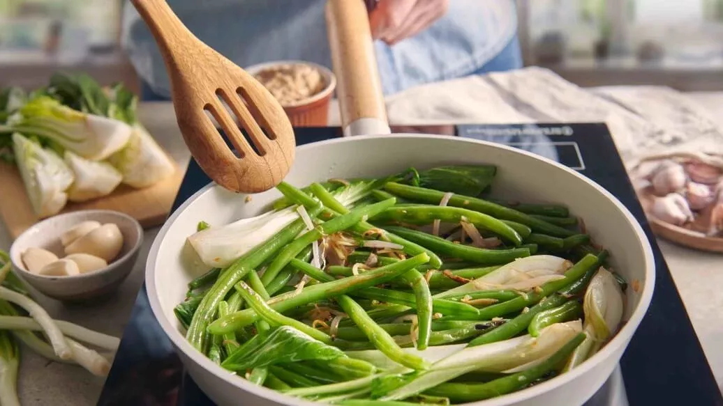 Corte finamente la chalota, el jengibre y el ajo. Vierta el aceite en una sartén y sofría las verduras durante 1 minuto. Añada las judías verdes y sofríalas durante 3-4 minutos. Agregue el pak choi.
