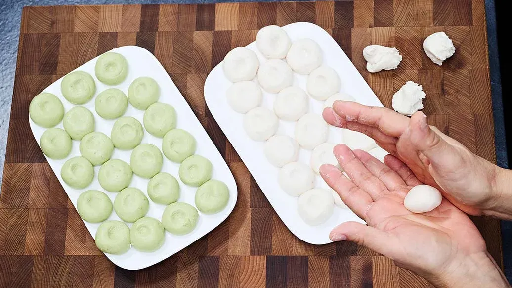 Mochis de té matcha con salsa de mango