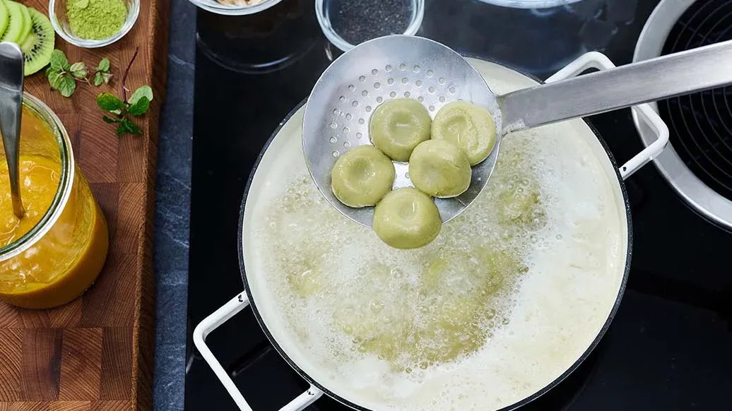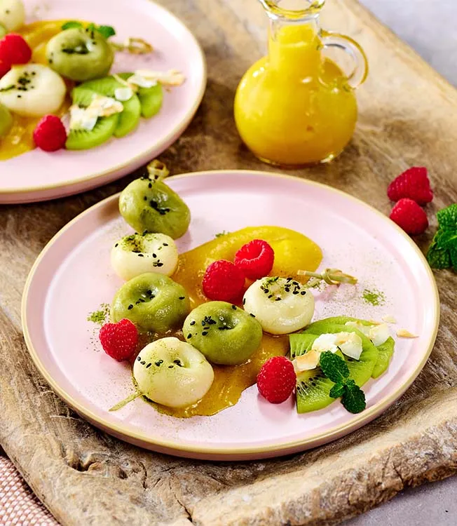 Una vez cocidos los dumplings, retírelos, enfríelos brevemente en agua fría o con hielo y escúrralos bien. Sírvalos en los platos con la salsa de mango y decórelos con el kiwi, la menta, un poco de matcha en polvo, sésamo negro, copos de coco y frambuesas.