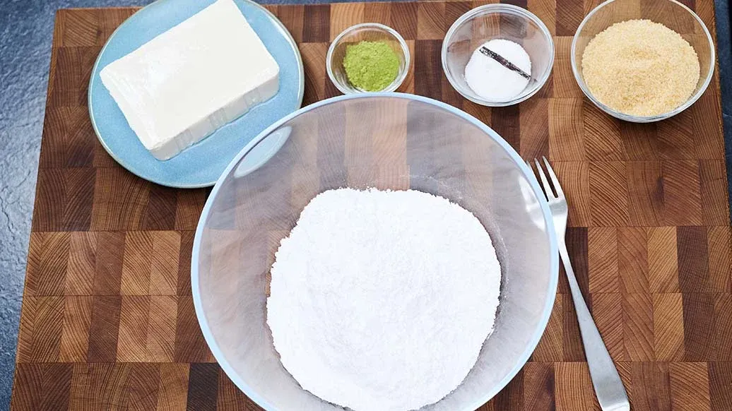 200 g de tofu sedoso – 200 g de harina de arroz – 3 cucharadas de azúcar moreno – 2 cucharaditas de azúcar avainillado con vainilla bourbon – 1 cucharadita de polvo de matcha