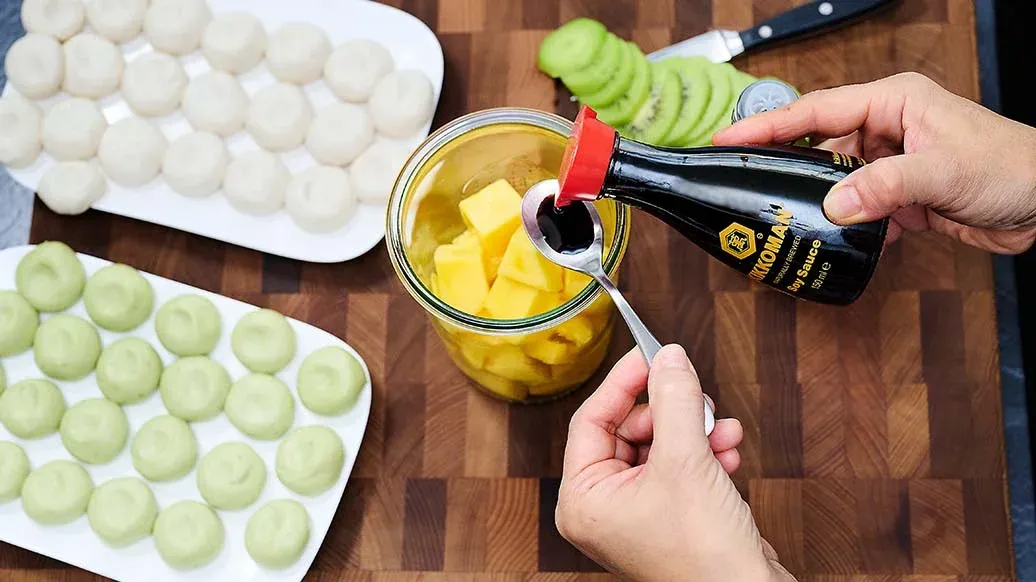 Triture el mango junto con la Salsa de Soja Naturalmente Fermentada Kikkoman y la Salsa dulce estilo Mirin Kikkoman. Pele los kiwis y córtelos en rodajas o en dados.