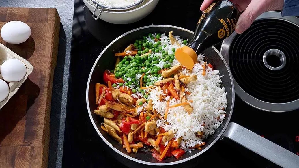 El nasi goreng, el popular arroz frito indonesio, se prepara en pocos minutos, queda muy sabroso y está lleno de matices. Con pollo tierno, verduras crujientes, un huevo frito por encima y el toque dulce e intenso de la Salsa para arroz Kikkoman, es una excelente manera de aprovechar el arroz que haya sobrado del día anterior.