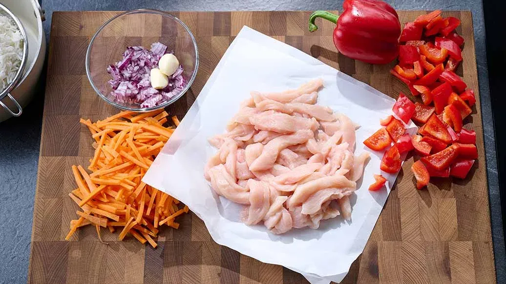 Cueza el arroz según las indicaciones del paquete y resérvelo. Corte la pechuga de pollo en tiras. Pele las zanahorias y córtelas en juliana fina. Trocee los pimientos rojos y pique finamente la cebolla y los dientes de ajo.