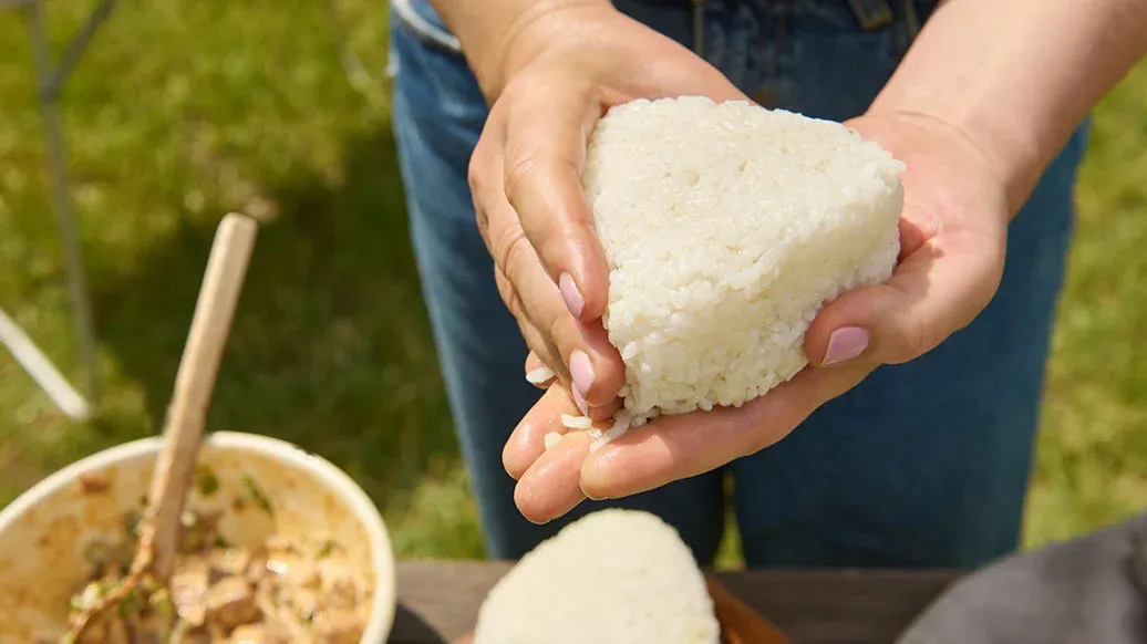 El onigiri mezcla la tradición japonesa con las influencias coreanas. Estas bolas de arroz ligeramente ácidas, rellenas de atún picante y acompañadas de salsa kimchi, representan una deliciosa alternativa a los bocadillos. ¡Pruebe este u otros rellenos para darles un toque delicioso y original!