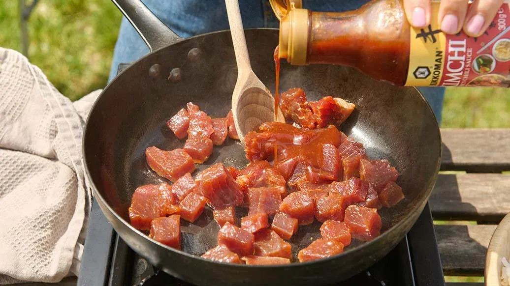Corte el atún en dados. Añada la Salsa picante de Guindilla para Kimchi Kikkoman, el mirin y el Aceite de Sésamo Kikkoman y mezcle bien. Sofría brevemente en una sartén bien caliente. Deje enfriar después de freír.