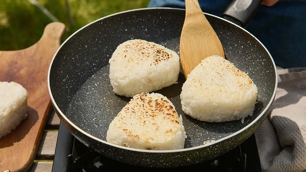 Opcionalmente, se puede freir el onigiri en una sartén caliente para dorarlo antes de envolverlo en nori.