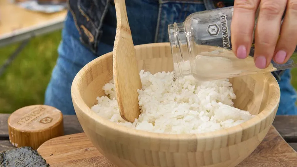 Enjuague el arroz para sushi en agua fría al menos cinco veces. Hiérvalo con agua en una proporción de 1:1,5. Mezcle bien el vinagre de arroz, el azúcar, la sal y el agua en un bol. Añada el adobo al arroz caliente y mézclelo.