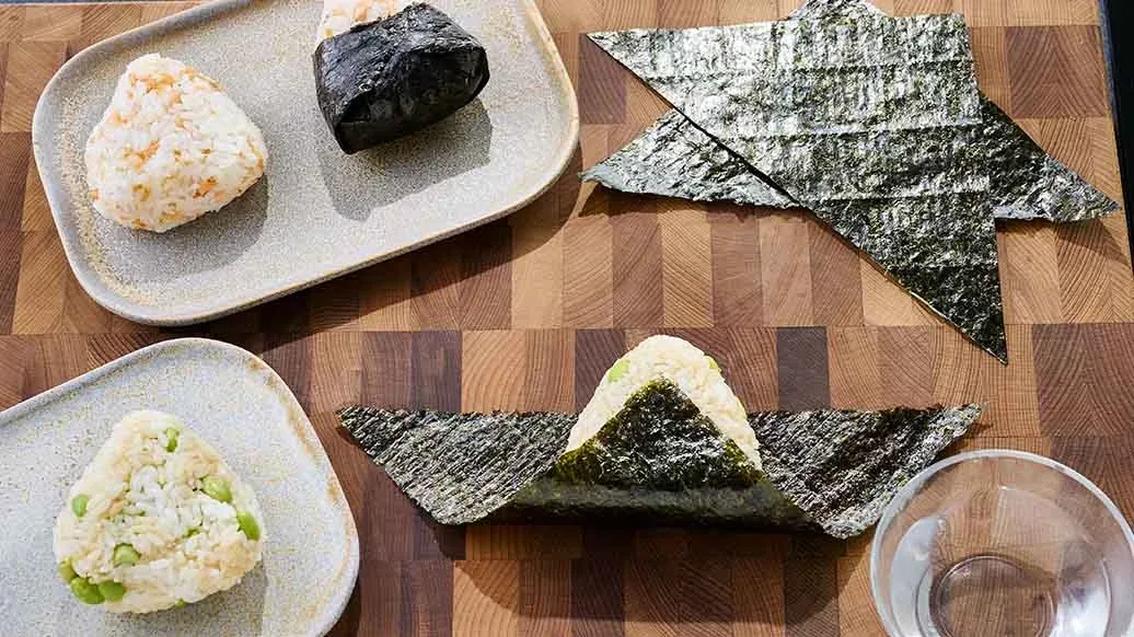 Corte la hoja de nori en triángulos, envuélvalos alrededor de los onigiri y sirva.