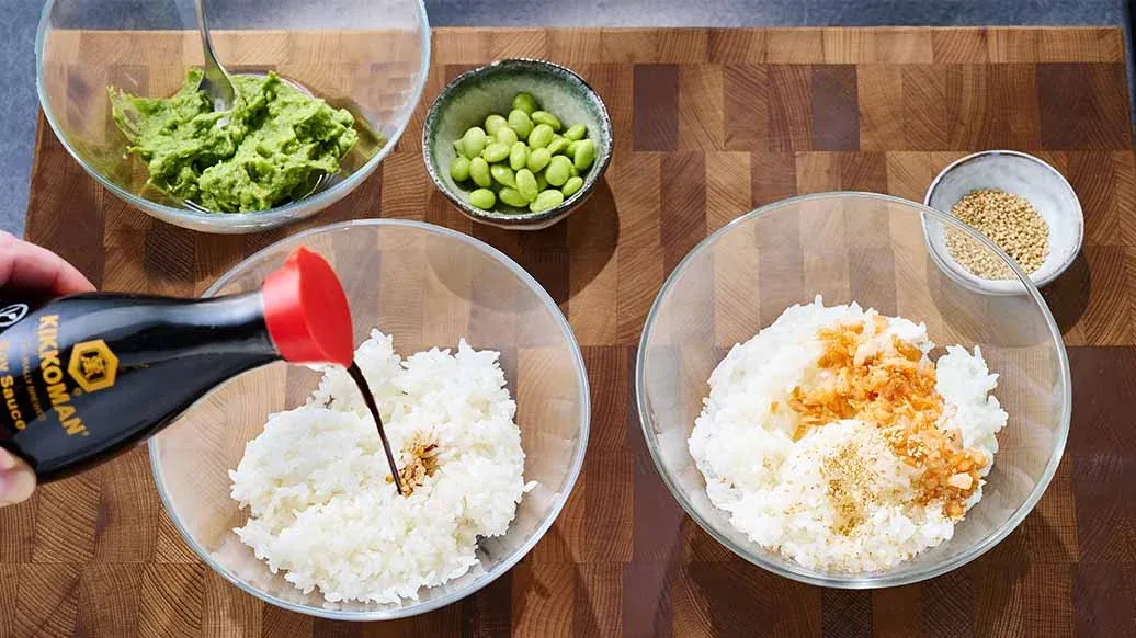 400 g de arroz cocido – ½ cucharadita de semillas de sésamo blanco – 20 g de edamame cocido – 1 cucharadita Kikkoman Salsa de Soja naturalmente fermentada