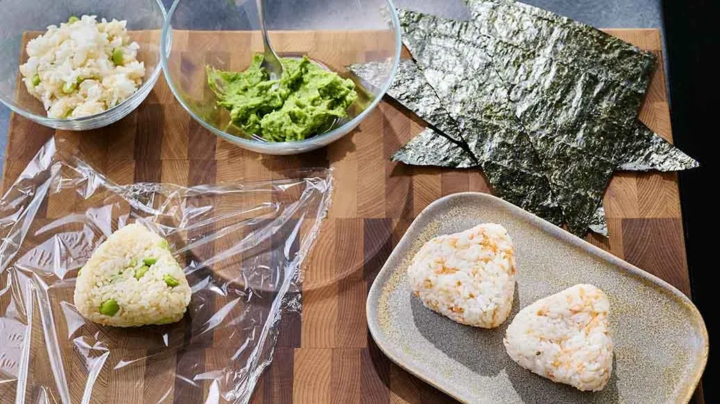 Uno de los onigiri más populares de Japón, relleno de jugoso salmón mezclado con arroz. El arroz con edamame y cremoso aguacate aporta un toque de frescor y color. Como alternativa, puede colocar el salmón entero en el centro.