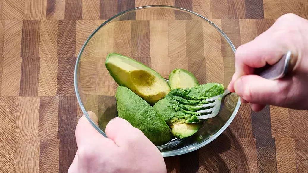 Forme triángulos con la mezcla de arroz y salmón utilizando film transparente. Dé forma al arroz con edamame formando 2 discos planos sobre el film. Coloque el aguacate en el centro de cada uno y moldee en forma de triángulo. Retire el film transparente.