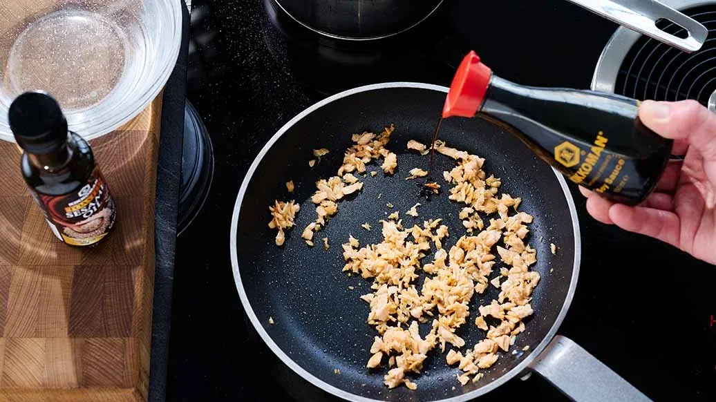 Cueza el filete de salmón en un cazo pequeño con agua hirviendo durante aproximadamente 2 minutos. Páselo a un bol con agua fría durante 1 minuto, retírelo y séquelo con papel de cocina. Fríalo por ambos lados en una sartén con el Aceite de Sésamo Tostado Kikkoman caliente. Píntelo con la Salsa de Soja Kikkoman y, continúe friendo hasta que esté bien hecho. Desmenúcelo en trozos.