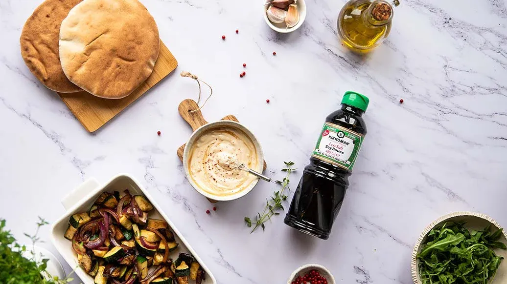 Mezcle el yogur con la Salsa de Soja con menos sal Naturalmente Fermentada Kikkoman, el ajo, la miel y la pimienta rosa. Unte la mezcla en el interior de los panes de pita y rellénelos con la rúcula, las verduras asadas y el queso camembert rebozado.