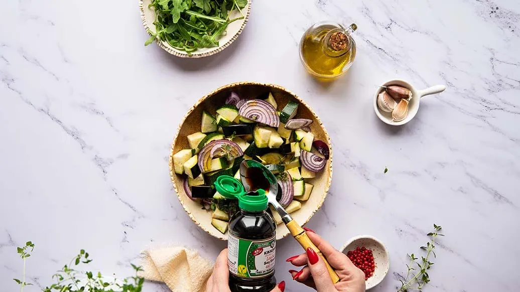 100 g de berenjena – 100 g de calabacín – 40 g de cebolla morada – 1 cucharada de aceite de oliva – 1 cucharada Kikkoman Salsa De Soja con menos sal naturalmente fermentada – 1 cucharadita de tomillo fresco picado