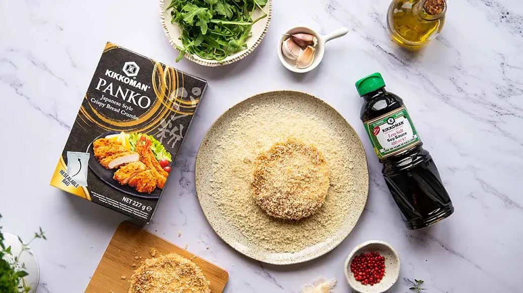 120 g de queso camembert – 1 huevo – 1 cucharada Kikkoman Salsa De Soja con menos sal naturalmente fermentada – 1 cucharadita de sriracha – 20 g Kikkoman Panko - Pan rallado crujiente estilo japonés – 3 cucharadas de aceite de oliva