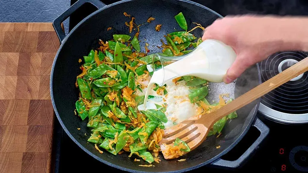 Pique finamente el ajo y fríalo en el Aceite de Sésamo Kikkoman calentado en un wok grande o sartén. Añada el kimchi y los guisantes dulces (córtelos por la mitad si es necesario) y fríalos brevemente. Vierta la nata, lleve a ebullición y cocine a fuego lento durante unos 5 minutos.
