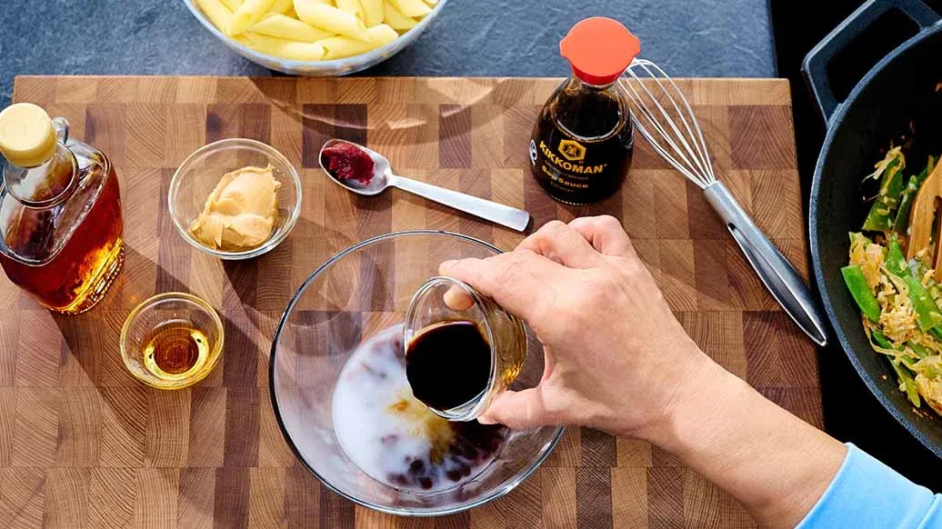 Cocine la pasta según las instrucciones del paquete y reserve unos 100 ml del agua de cocción al escurrirla. Mezcle el agua de cocción con la pasta gochujang, la mantequilla de cacahuete, el sirope de arce y la Salsa de Soja Kikkoman.