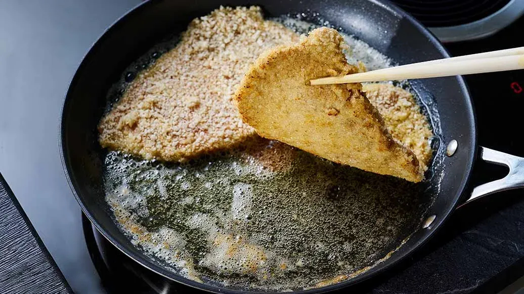 Coloque la carne de cerdo entre dos capas de film transparente o en una bolsa de congelación. Utilizando un ablandador de carne o una cacerola con mango, machaque cuidadosamente la carne hasta que quede fina. Deje adobar en la Marinada Teriyaki Kikkoman durante unos 15 minutos. Enharine el escalope marinado, páselo por huevo batido y, por último, por Panko Kikkoman.
