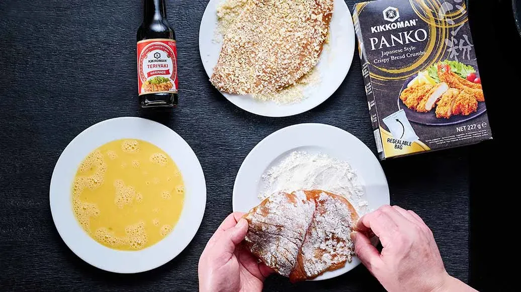 2 filetes de cerdo (130 g cada uno aprox.) – 100 ml Kikkoman Salsa Estilo Japonés Teriyaki para Marinados – 40 g de harina – 2 huevos – 50 g Kikkoman Panko - Pan rallado crujiente estilo japonés
