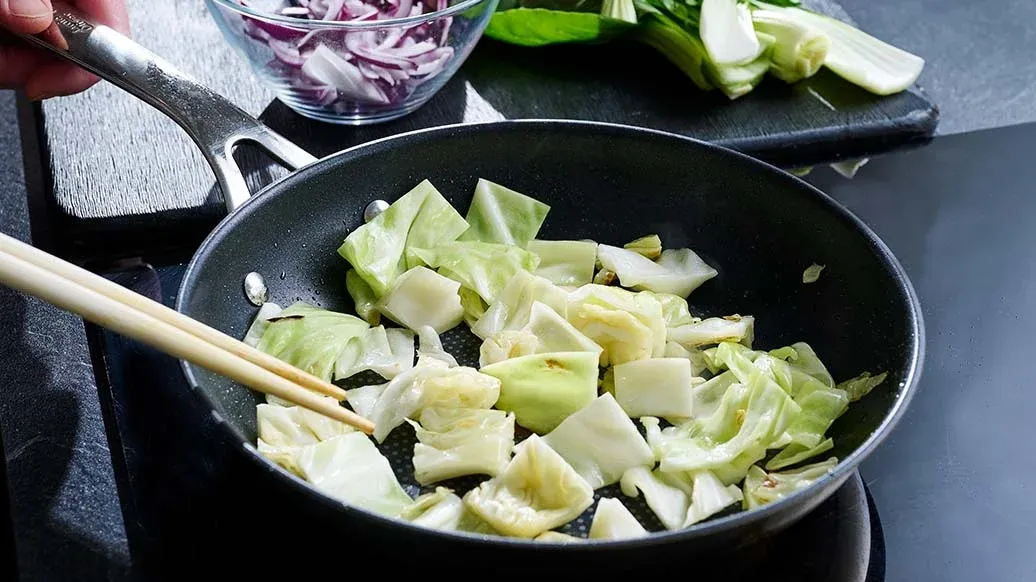 Corte la col puntiaguda en trozos pequeños y fríala en una sartén con 1 cucharada de aceite de girasol a fuego medio. En cuanto esté cocida, añada 1 cucharaditas de Salsa de Soja Kikkoman, sofríala brevemente y retírela. Corte la cebolla en tiras, fríala en ½ cucharada de aceite caliente y sazónela con 2 cucharaditas de Salsa de Soja Kikkoman. Corte el pak choi en tiras anchas, fría de la misma manera con 1 cucharada de aceite y añada 1 cucharadita de Salsa de Soja Kikkoman.