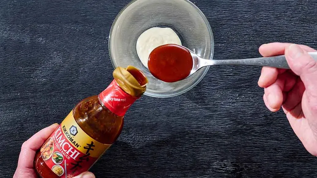 2 cucharadas Kikkoman Salsa picante de Guindilla para Kimchi – 2 cucharadas de mayonesa – Algunas hojas de perejil de hoja plana