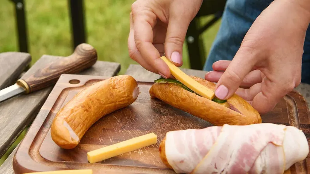 Salchichas rellenas de queso y jalapeño envueltas en beicon crujiente y glaseadas con Salsa Barbacoa Teriyaki con miel: una mezcla perfecta entre sabores salados y dulces.