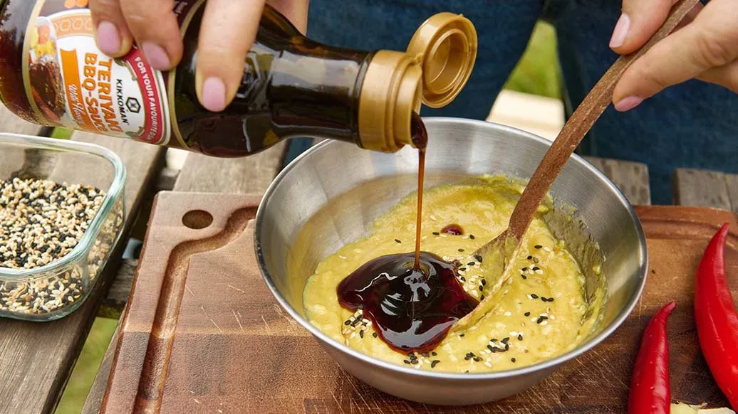 Mezcle en un bol la mostaza con la Salsa Barbacoa Teriyaki con miel Kikkoman, la miel, el jengibre, las semillas de sésamo y el aceite de sésamo.