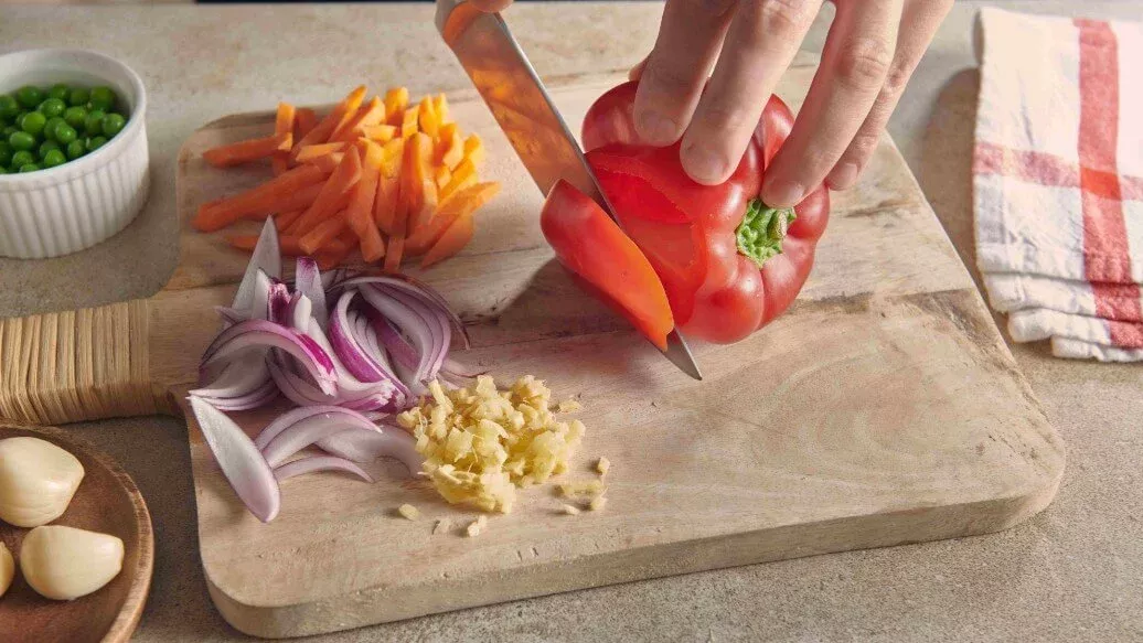 Pique finamente el ajo y el jengibre. Corte el pimiento y la zanahoria en tiras y la cebolla roja y el pak choi en trozos más grandes.
