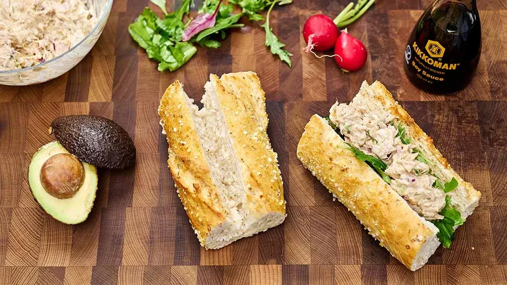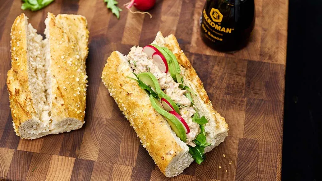 Pan integral lleno de sabor, con una suave ensalada de atún, lechuga fresca y aguacate, combinados con Salsa de Soja Kikkoman y yogur griego. Un bocado saludable y equilibrado, potenciado con un aliño cremoso de soja y wasabi para darle un original toque oriental.