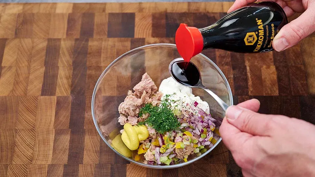 100 g de atún al natural escurrido (en agua) – 80 g de yogur griego – 40 g de pimiento amarillo, cortado en dados – 1 cucharadita de cebolla morada, finamente picada – 20 g de apio, finamente picado – ½ cucharadita de zumo de limón – 3 cucharaditas Kikkoman Salsa de Soja naturalmente fermentada – 1 cucharadita de eneldo fresco, picado – ½ cucharadita de mostaza picante – ¼ cucharadita de pimienta negra recién molida