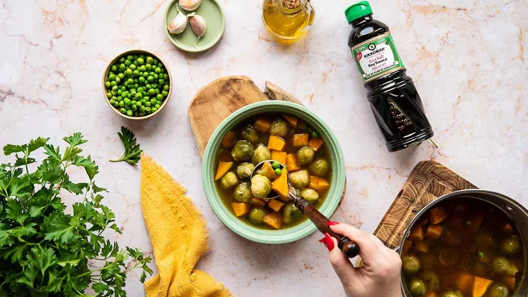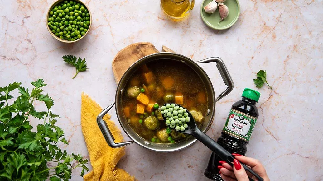 Sopa de boniato, guisantes y coles de Bruselas, ideal para un almuerzo reconfortante en pleno invierno. El sabor se realza con la Salsa de Soja con menos sal Naturalmente Fermentada Kikkoman, que le confiere una profundidad especial.