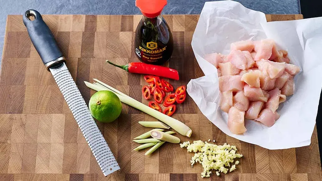 Corte la citronela en trozos. Pele el jengibre y rállelo o píquelo finamente. Ralle la piel de la lima y exprima su zumo. Corte la guindilla en rodajas y la pechuga de pollo en dados pequeños.