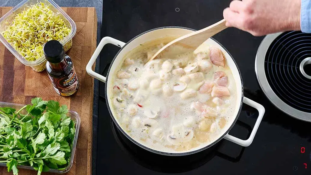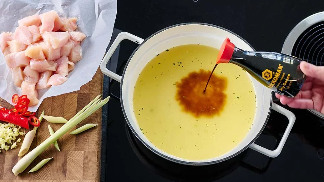Lleve el caldo de pollo a ebullición junto con la Salsa de Soja Naturalmente Fermentada Kikkoman. Añada la citronela, el jengibre, un poco de ralladura y zumo de lima, la guindilla, la leche de coco y el azúcar. Caliente todo sin que llegue a hervir.