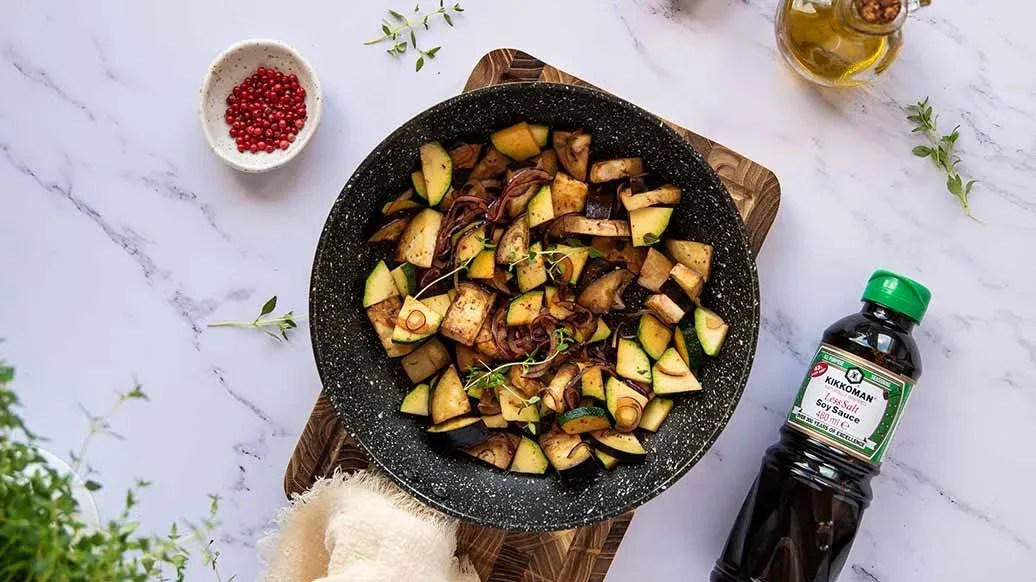 100 g de queso camembert – 100 g de berenjena – 100 g de calabacín – 50 g de cebolla morada – 1 cucharada de aceite de oliva – 1 cucharada Kikkoman Salsa De Soja con menos sal naturalmente fermentada – 1 cucharadita de tomillo fresco picado – ¼ cucharadita de pimienta rosa