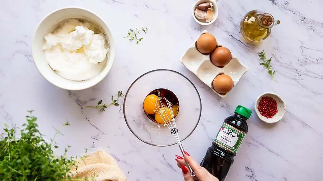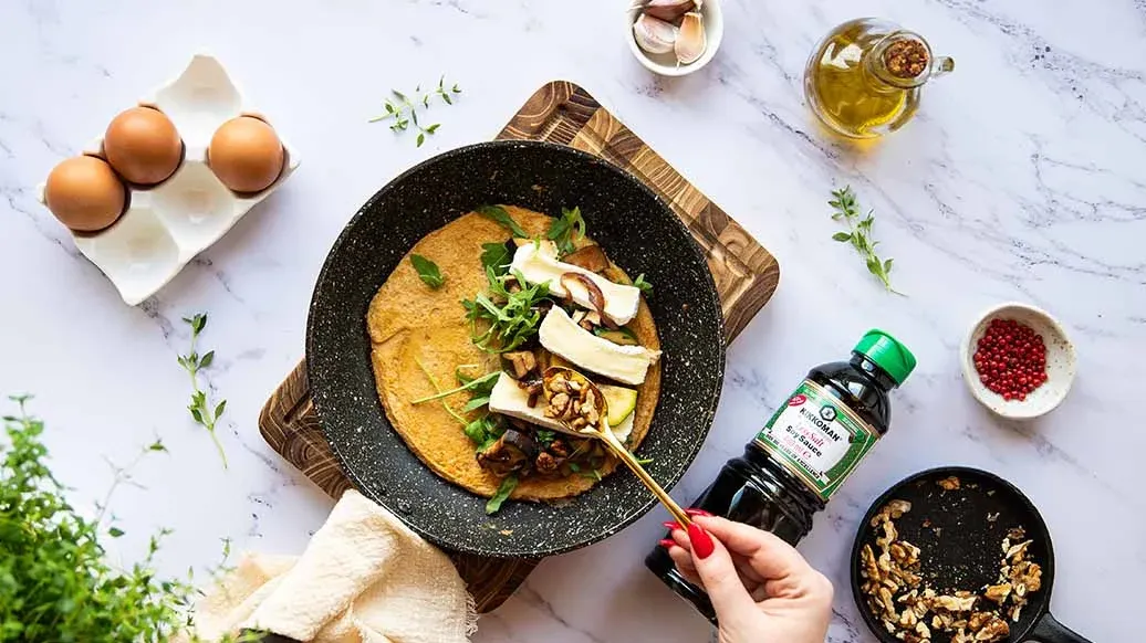 Una suave tortilla con berenjena y calabacín salteados y queso camembert derretido, realzada con un toque de Salsa de Soja Kikkoman para un sabor más complejo. Sencilla de preparar e ideal para una comida ligera.