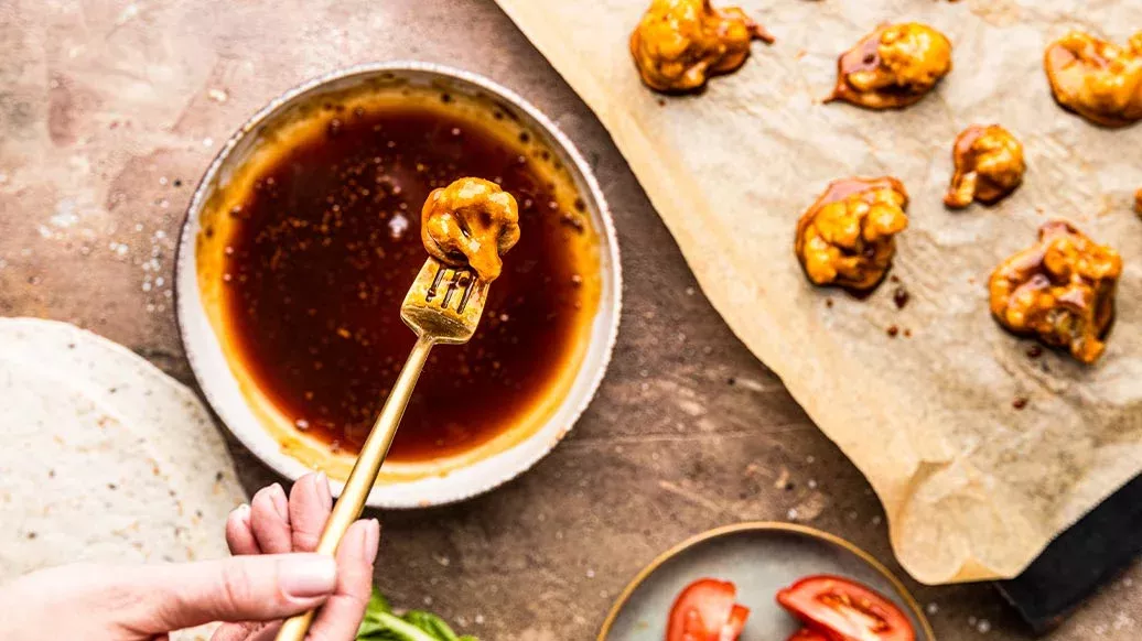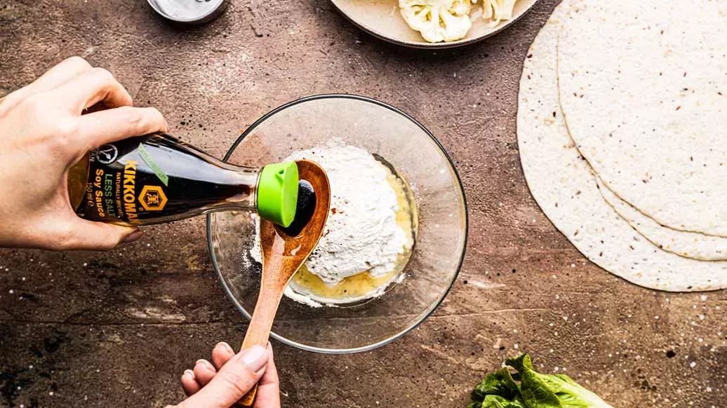 Bocaditos de coliflor rebozados y horneados a la perfección, cubiertos con Salsa Teriyaki con ajo asado Kikkoman, todo enrollado en una tortilla con lechuga fresca, tomates maduros y crujientes anacardos tostados.