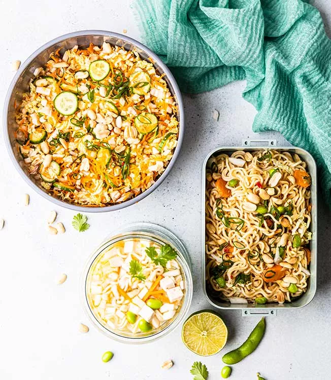 Platos rápidos para el almuerzo: ramen de miso en tarro, ramen de verduras fritas y ensalada de pak choi