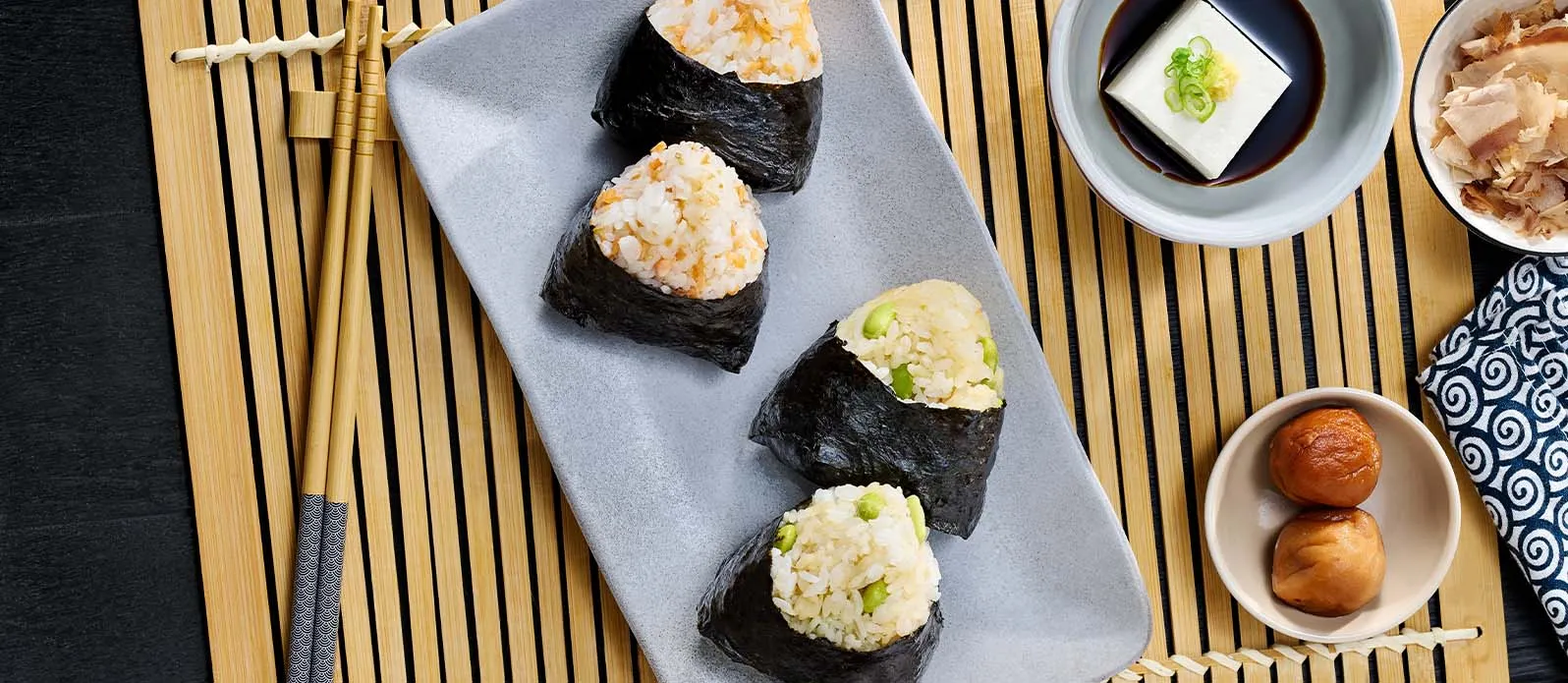 ¿Prefiere un tentempié? Pruebe con yaki onigiri con miso y queso, o regálese el placer de probar nuestra propuesta fusión: arroz con pato y chorizo.