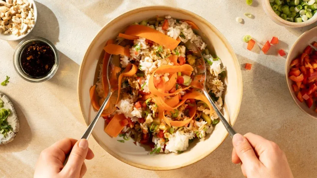 Hay muchas formas deliciosas de aprovechar el arroz sobrante: una excelente opción es el arroz frito con huevo picante, verduras y harissa, o un clásico como el nasi goreng.